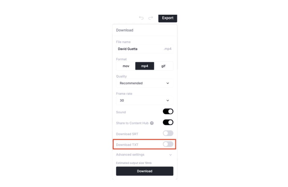 You can now download captions as a TXT file directly from the export panel. The toggle appears next to “Download SRT.”